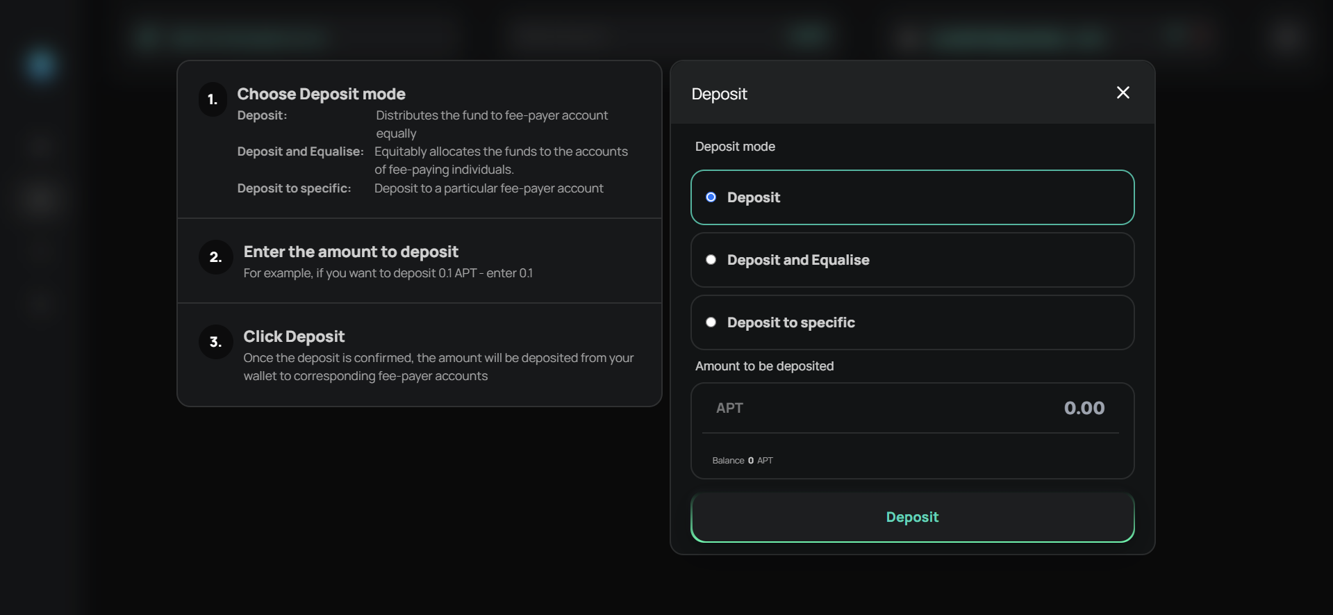 After registering, you will need to go to the deposit tab in order to deposit allowance and view your allowance balance. In the Deposit tab enter the amount you want to deposit. You need to send the desired amount of APT tokens only from your registered wallet address.